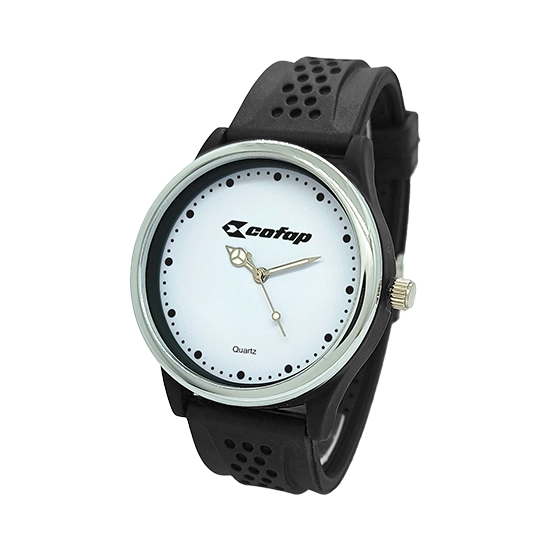 Relógio de pulso analógico mecanismo Quartz máquina SL68, caixa em ABS na cor branca fosco com aro preto, pulseira de borracha PVC flexível e macia com detalhes de bolinha dupla face na cor branca
